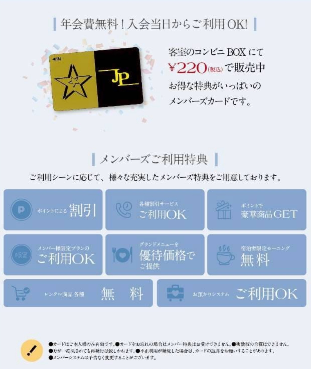 ジュピターのメンバーズカードは、客室のコンビニBOXにて220円(税込)で販売中です。